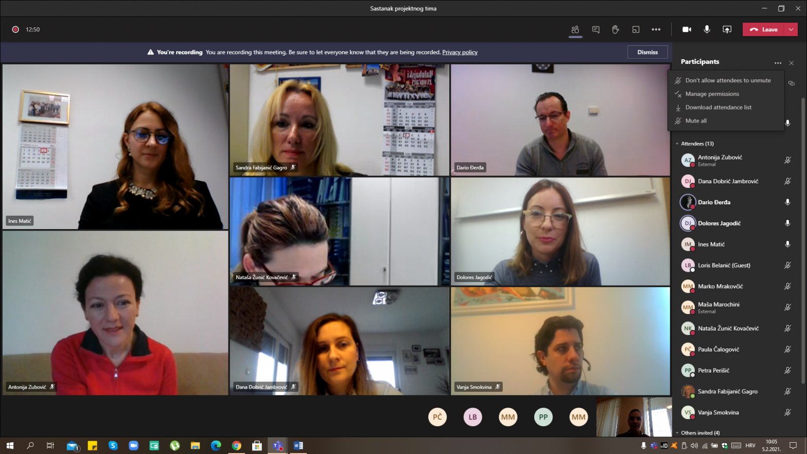 U petak 5. veljače, online na platformi MS Teams, održan je sastanak projektnog tima. Predstavile su se nove članice tima a bilo je riječi o do sada izvršenim projektnim aktivnostima kao i o budućim planovima.